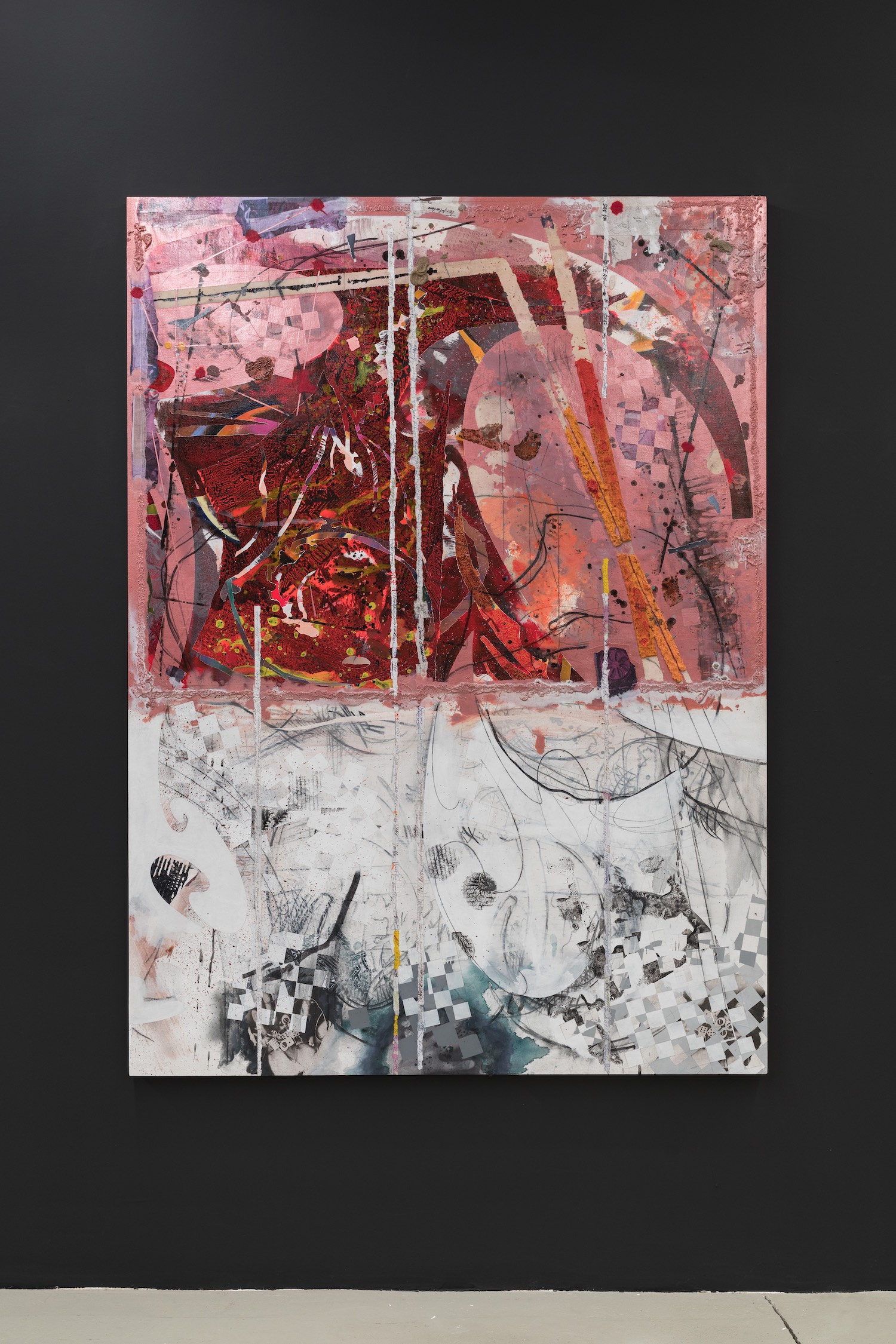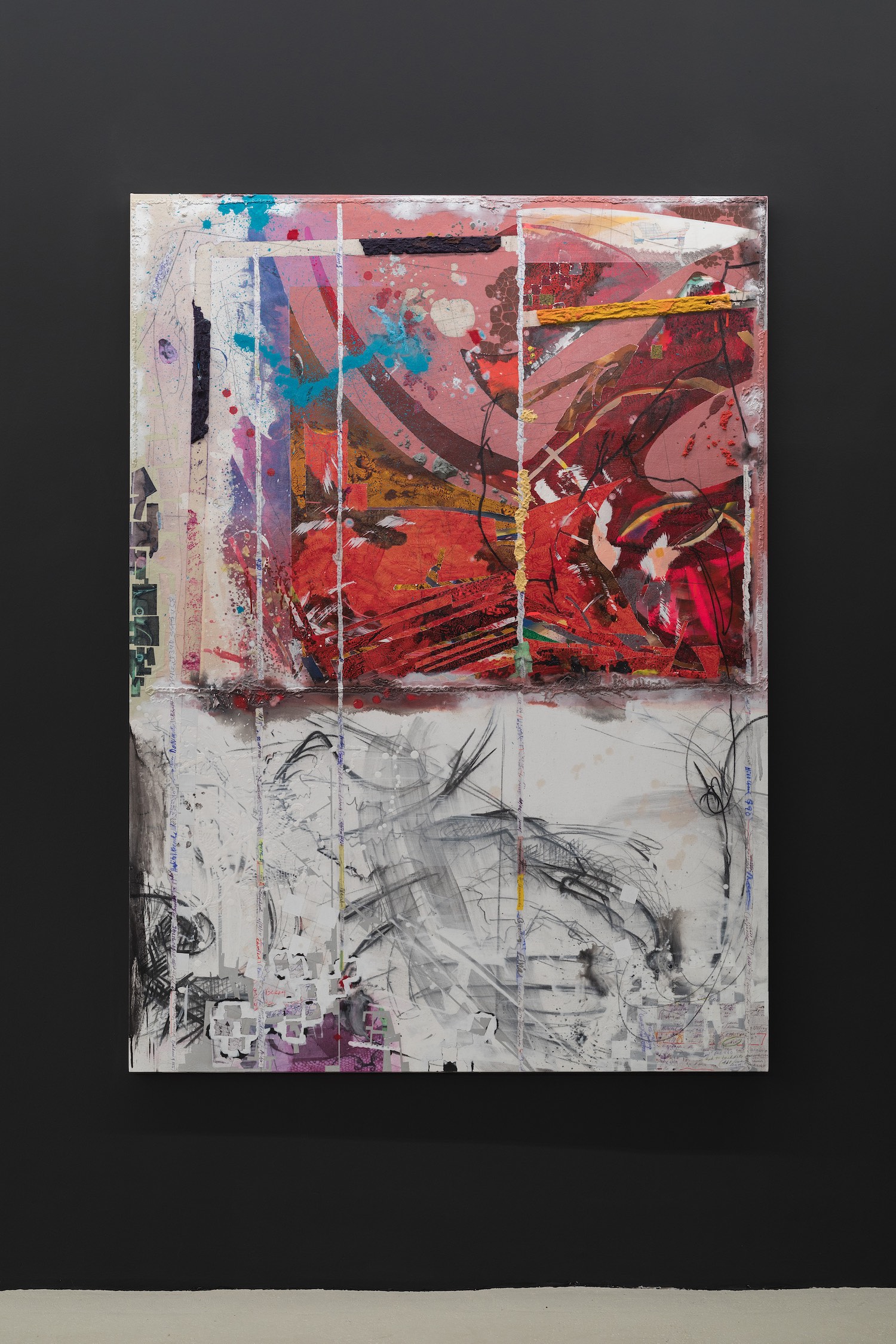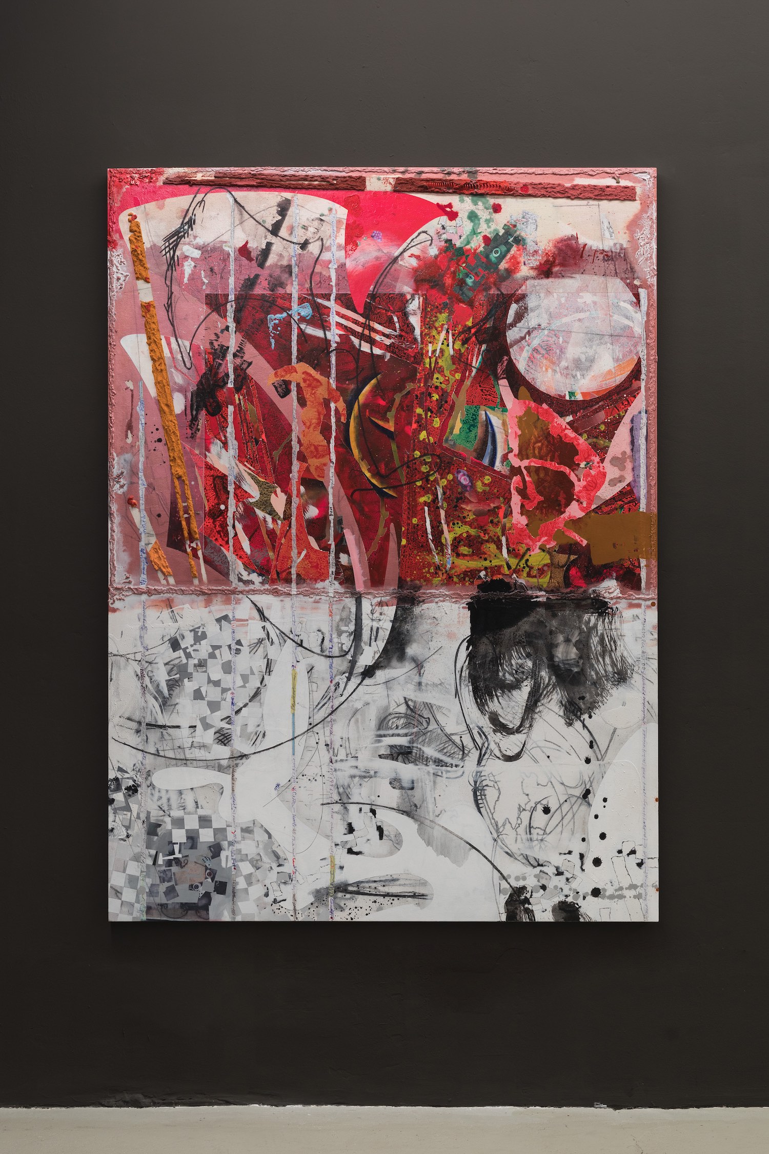 Turning White and Turning Red, 2020. Acrylic, charcoal, modelling paste, sand, and collage on canvas, 167 x 121 cm.