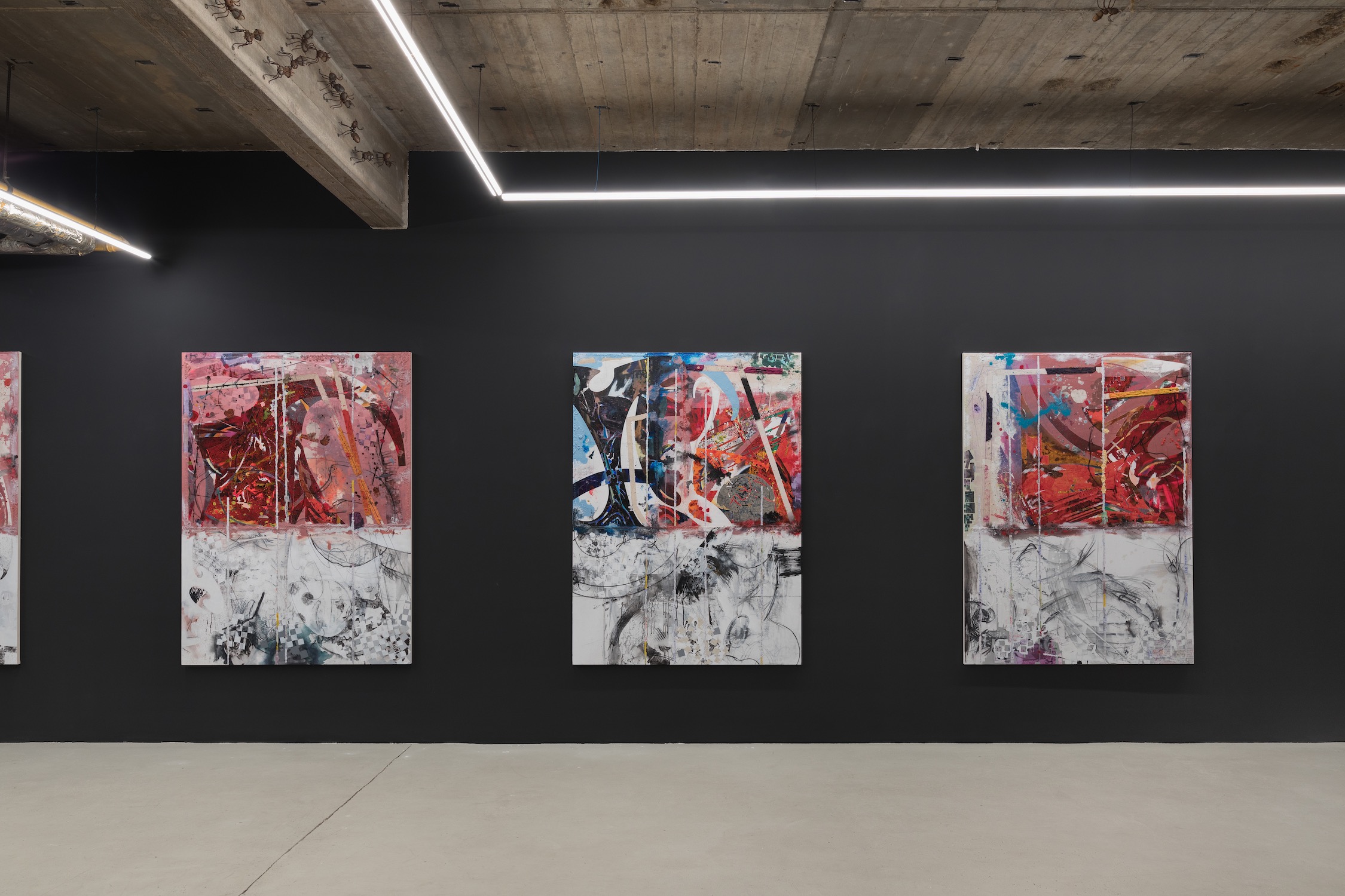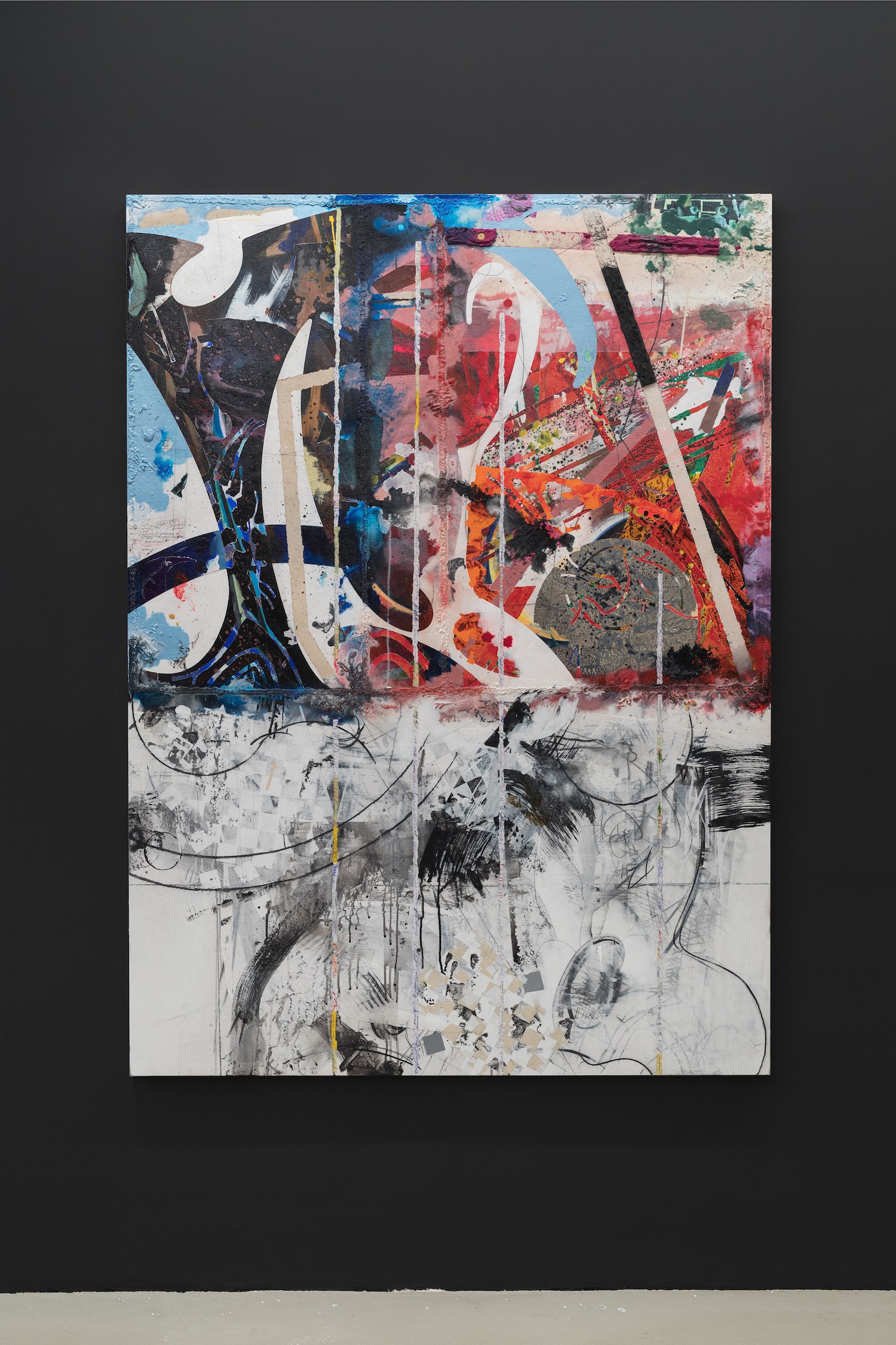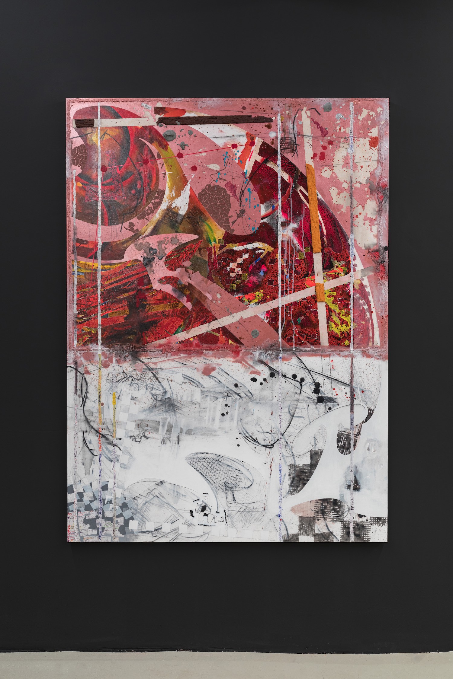 Turning White and Turning Red, 2020. Acrylic, charcoal, modelling paste, sand, and collage on canvas, 167 x 121 cm.