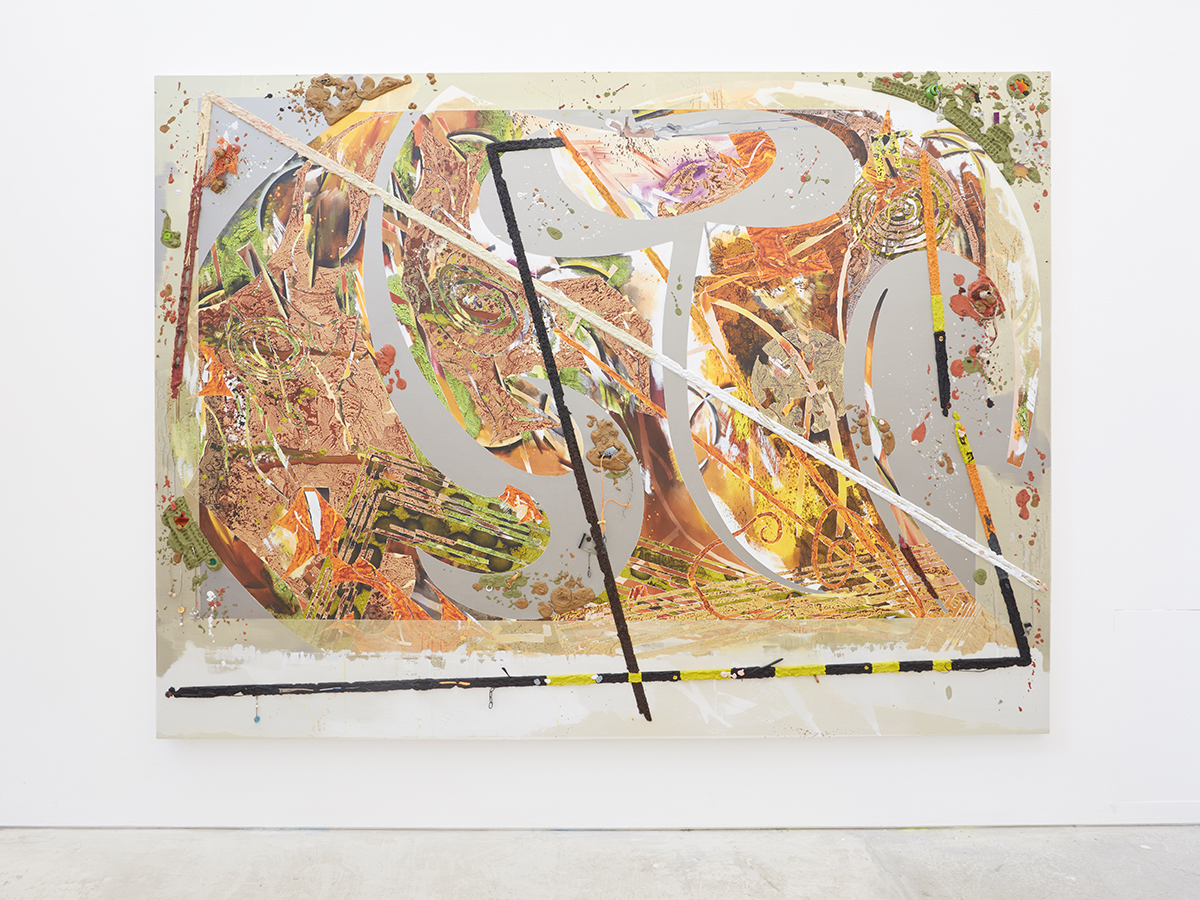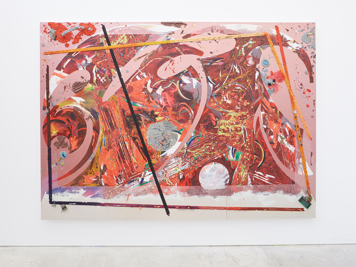 Chocking on Multicoloured Scarves, 2016. Acrylic, modelling paste and found objects on canvas, 196 x 265 cm.