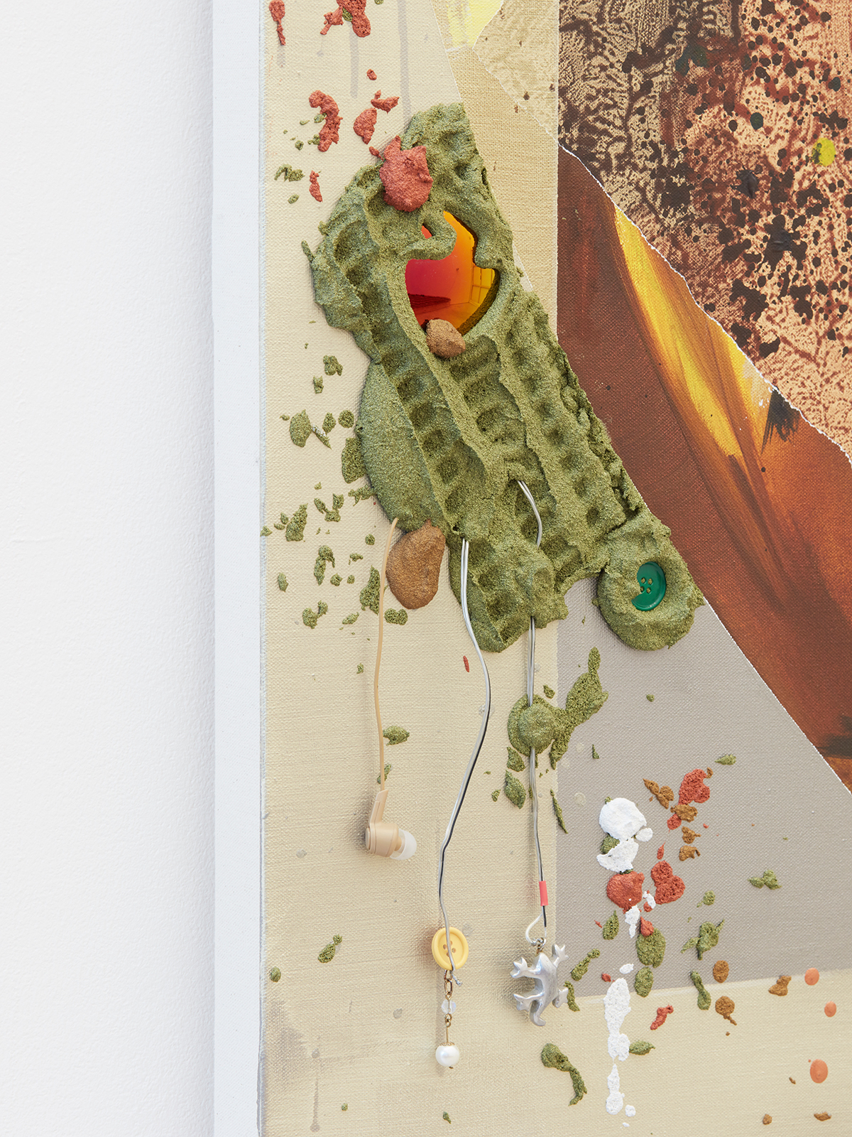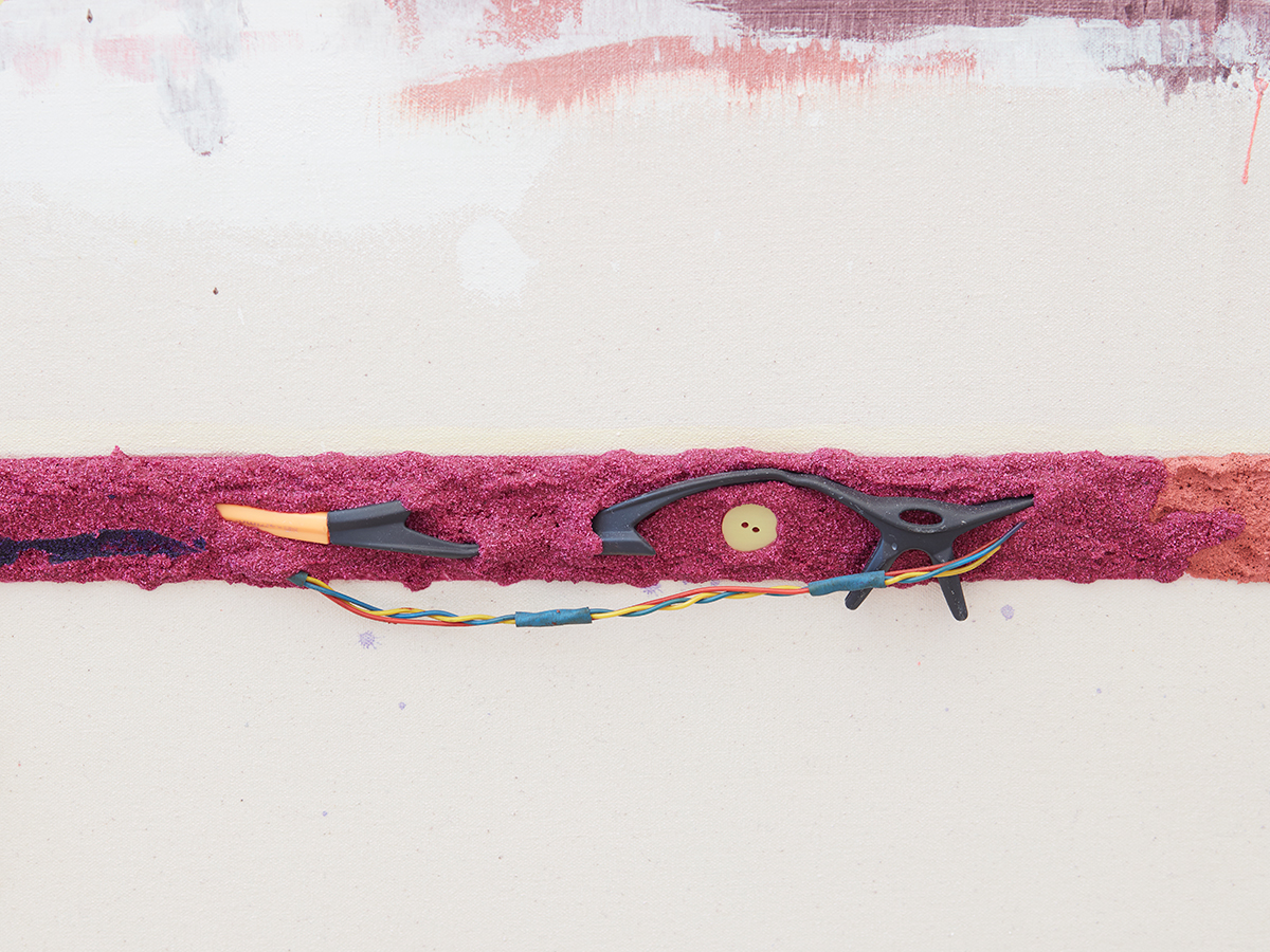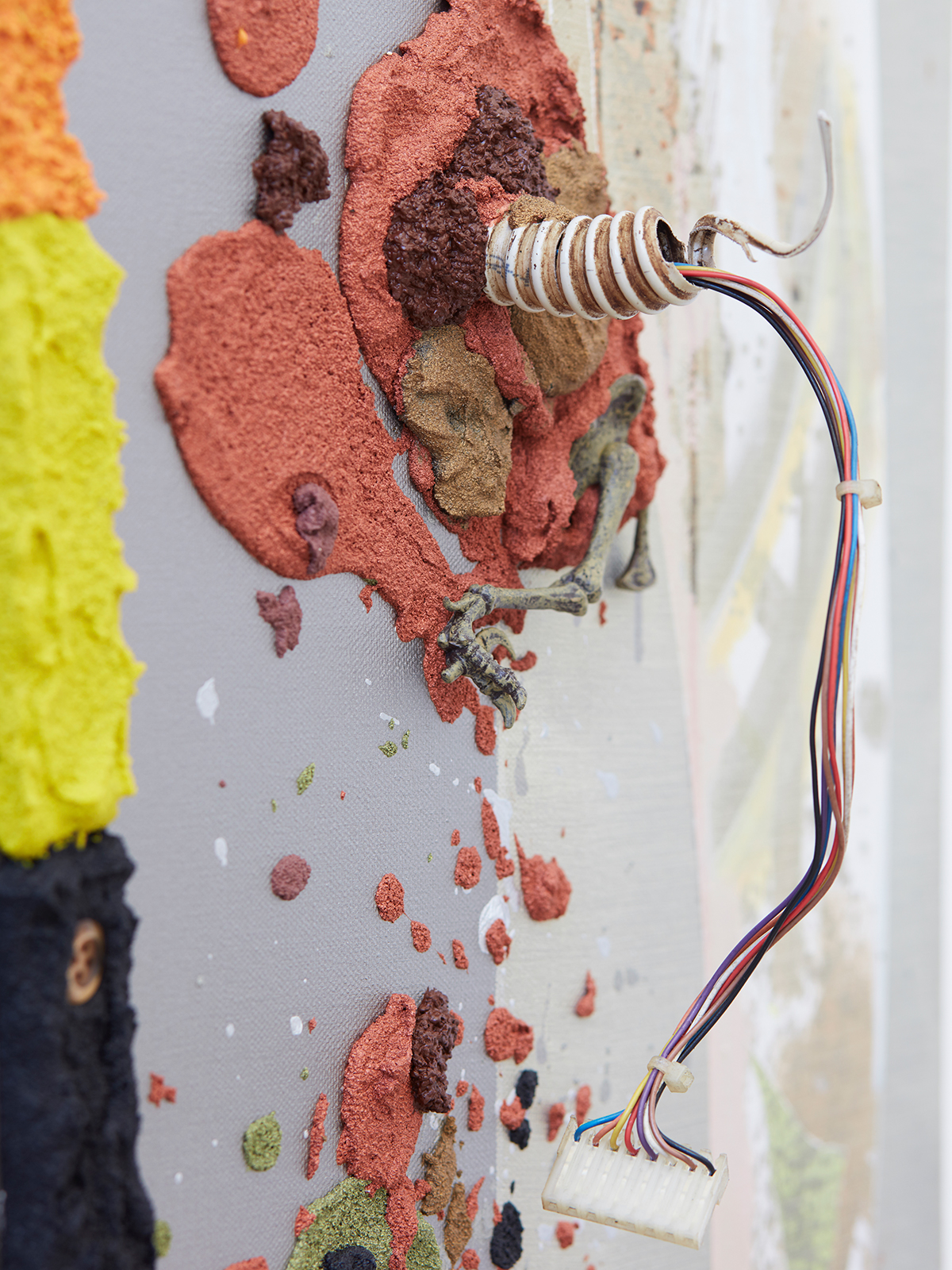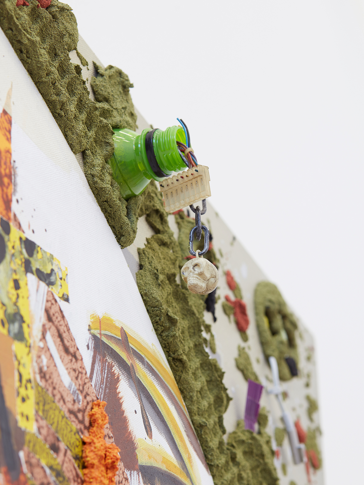 Chocking on Multicoloured Scarves (Detail), 2016. Acrylic, modelling paste and found objects on canvas, 196 x 265 cm.